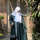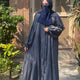 A graceful modest fashion look featuring a flowing dark grey abaya. The abaya is designed with a loose fit for comfort and elegance, accented with subtle pleated details on the chest and gathered sleeves with buttoned cuffs. The lightweight fabric drapes naturally, creating a refined silhouette perfect for both casual...